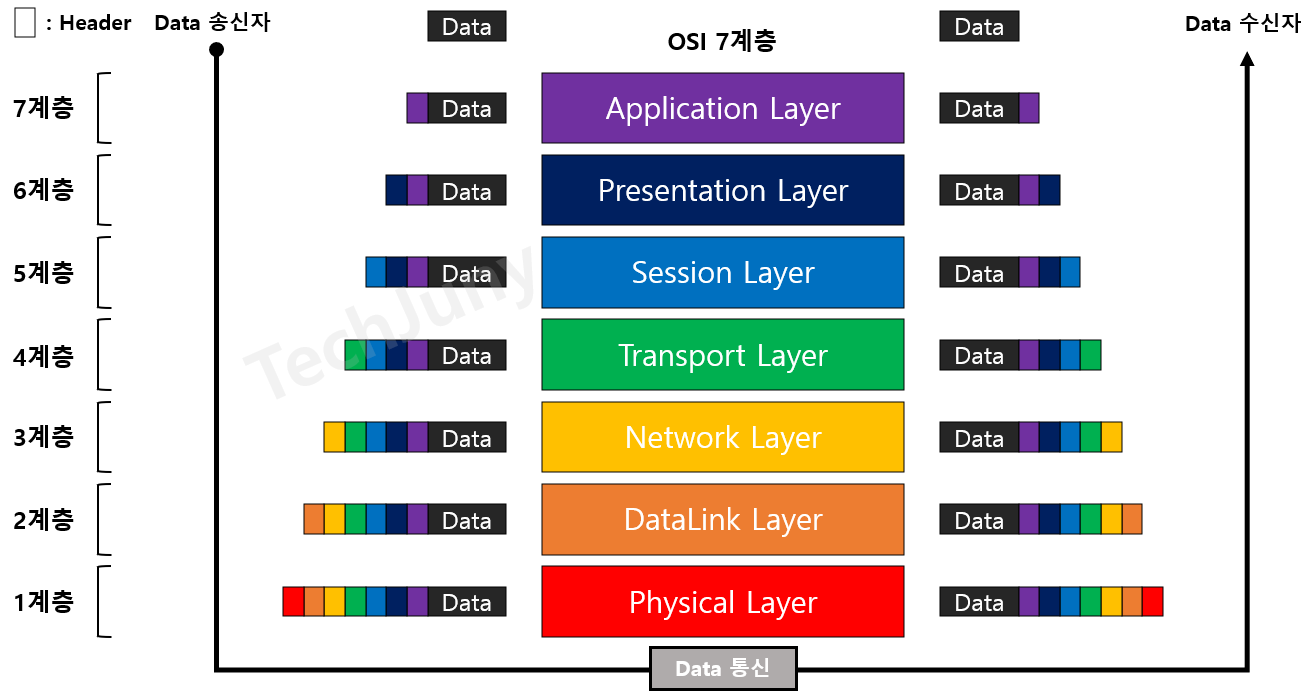 데이터를 송신하는 과정에서 OSI 7계층 각 단계를 거칠 때마다 해당 계층의 헤더가 붙여서 데이터 전송을 한다.