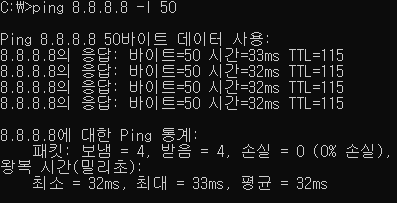- Ping [목적지 IP] -l [패킷 사이즈]